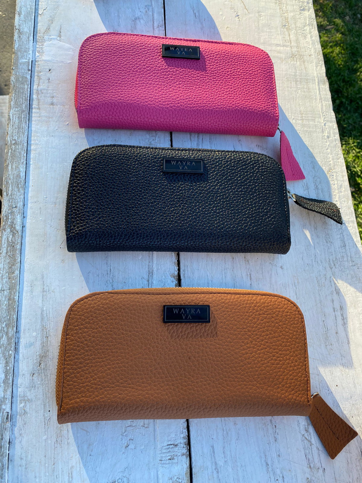Billetera de ecocuero de 21 cm de alto x 10 cm de ancho. Interior con división para 6 tarjetas, efectivo , monedero con cierre y bolsillo .